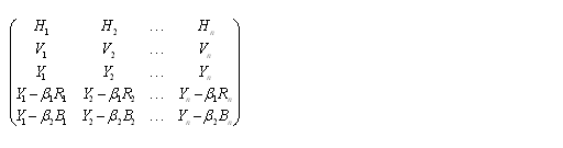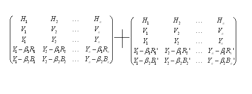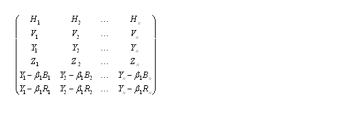 而現(xiàn)在的偽立體電視是由行向量H,幀向量V,亮度向量Y組成的三維線(xiàn)性空間。表達(dá)彩色信息的是由紅向量R,R',綠向量G,G',蘭向量B,B'組成的。共有H,V,Y,R,G,B,R',G',B'九個(gè)向量,通過(guò)不同的線(xiàn)性組合,組成的三維線(xiàn)性空間??捎靡韵伦笥叶€(gè)的矩陣來(lái)表示: