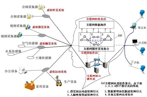 Google的街景系統(tǒng),中國水利部的防汛抗旱傳感器網(wǎng)絡(luò),醫(yī)院的遠(yuǎn)程手術(shù)讓我們聯(lián)想到生物的視覺,軀體感覺和運(yùn)動神經(jīng)系統(tǒng)。到2008年我們發(fā)表論文,繪制出這樣一張互聯(lián)網(wǎng)虛擬大腦結(jié)構(gòu)圖。