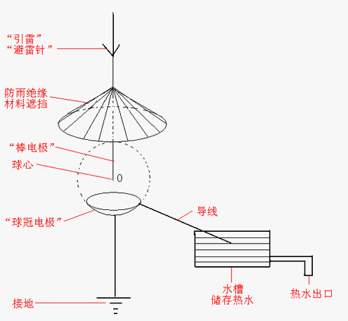 如圖7,可以在“雷擊村”,或其他發(fā)生“閃電”較多的區(qū)域,并且遠(yuǎn)離居民區(qū)的地方,放置一些大大小小的“棒電極——球冠電極”?!鞍綦姌O”樹立于空中,用于招引閃電,類似于“避雷針”,但必須與其接地的支撐物絕緣,并且深入到“球冠電極”球心的頂端部位,越細(xì)越好——越細(xì)激發(fā)的“球狀閃電”的能量越大?!扒蚬陔姌O”的頂端接地,在其邊沿接一導(dǎo)線引入水槽,在閃電放電時(shí),產(chǎn)生的“球狀閃電”可以沿導(dǎo)線進(jìn)入水槽,“球狀閃電”所含的部分能量——熱能可以加熱水,這樣“閃電”的能量,就可以通過“接轉(zhuǎn)”為“球狀閃電”,再把可以“暫時(shí)儲(chǔ)存能量”的“球狀閃電”的部分能量——熱能傳給水,人們就可以利用熱水用于工業(yè)生產(chǎn)或日常生活了。