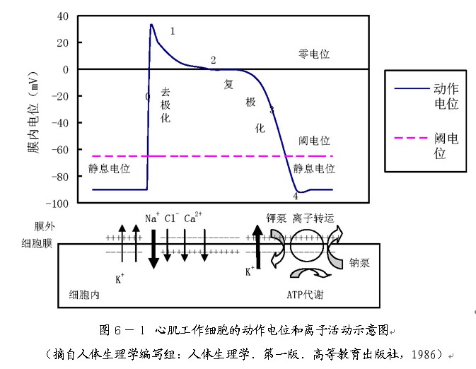 在上圖中,去極化(0期),心肌細胞受刺激后,靜息電位到達閾電位時,迅速激活鈉通道,使其開放,造成大量鈉離子內(nèi)流,動作電位迅速升高,鈉通道又迅速失活關閉;快速復極化初期(1期),鈉離子內(nèi)流停止,氯離子通透性升高,氯離子內(nèi)流,氯離子通道通透性也迅速下降;緩慢復極化期(2期),鈣離子緩慢內(nèi)流,與此同時,少量鉀離子外流,鈣離子通道的激活和失活過程均緩慢,故稱慢通道;快速復極化末期(3期),鉀離子外流;靜息期(4期),此期離子轉(zhuǎn)運活躍,即把動作電位形成期間流入膜內(nèi)的鈉離子,氯離子,鈣離子排出,又把外流的鉀離子攝回,這一過程通過心肌細胞膜上的Na+-K+泵的作用完成的,需要消耗ATP的生理過程。(本小節(jié)內(nèi)容摘自人體生理學編寫組:人體生理學.第一版.高等教育出版社,1986)
