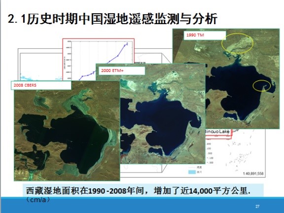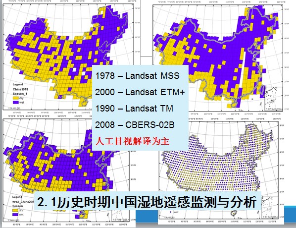 歷史時(shí)期中國(guó)濕地監(jiān)測(cè)與變化分析,因?yàn)闈竦貜?fù)雜性太難了,但是當(dāng)時(shí)已經(jīng)具備了所有遙感數(shù)據(jù),70年代的MSS,能全部覆蓋一次衛(wèi)星數(shù)據(jù)的,這是1978年MSS數(shù)據(jù),到了2000年,1990年,到了2008年我們用中巴衛(wèi)星數(shù)據(jù)做了研究,每期我們都出了大量的數(shù)據(jù),我們只想了解一下我們國(guó)家的濕地情況,就用最笨的方法人工目視解譯,做了大概3年時(shí)間,前后投入60、70個(gè)人做完這項(xiàng)工作,基本上對(duì)咱們國(guó)家濕地現(xiàn)狀有一個(gè)初步的了解。