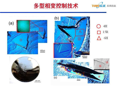 碳化硅晶體生長時(shí)如果臺(tái)階過寬,晶型沿 [0001] 方向的排列信息反應(yīng)不出來,會(huì)在臺(tái)階上自發(fā)成核,發(fā)生晶型轉(zhuǎn)變。研究發(fā)現(xiàn),當(dāng)晶體表面不光滑、不平整時(shí),易發(fā)生多型相變,4H會(huì)發(fā)生6H和15R相變。另一方面晶型轉(zhuǎn)變與生長室氣氛相關(guān),通過控制生長室氣氛解決了多型相變技術(shù)。