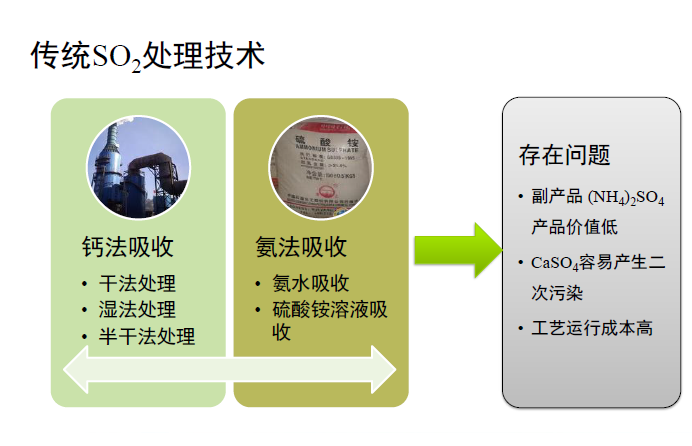 傳統(tǒng)的二氧化硫處理技術(shù)主要有鈣法吸收、氨法吸收,二者均存在運(yùn)行成本高,易產(chǎn)生二次污染的問題。