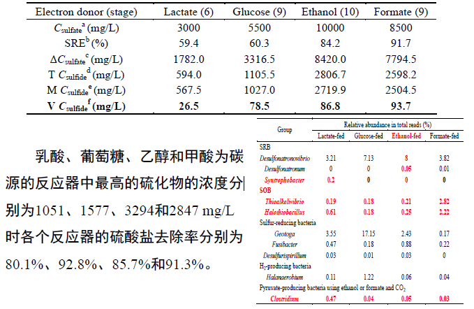 我們將嗜鹽嗜堿脫硫脫氮微生物應(yīng)用到實(shí)驗(yàn)室小試煙氣脫硫系統(tǒng)中,并選擇不同碳源作為電子供體時(shí)其最佳耐受硫化物濃度以及硫酸鹽去除效率(圖1-11)。結(jié)果發(fā)現(xiàn),乙醇為碳源是可耐受的硫化物濃度可高達(dá)3000 mg/L以上,硫酸鹽的去除率在90%左右。更多內(nèi)容見下表。