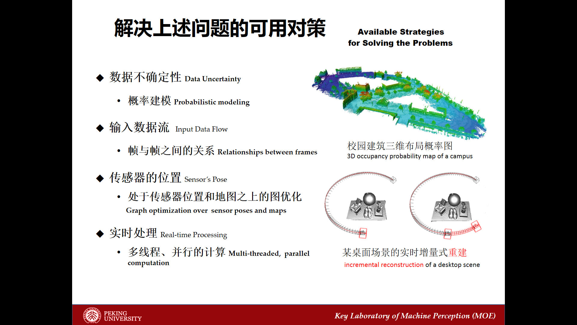 這里有一些對(duì)策,我給各位介紹一下相關(guān)的研究。我前面講的第一個(gè)問(wèn)題,就是數(shù)據(jù)的不確定性的處理。我們做定位也好,做建模也好,要有一個(gè)通用的空間的描述,這個(gè)描述有了以后能夠把這些做好。空間的描述就是方位構(gòu)圖,有各種各樣的描述方式。以前講的描述方式是“零、一”關(guān)系,里面有物體就是一,沒(méi)物體就是零。但是現(xiàn)在描述空間可能不是“零、一”的關(guān)系,對(duì)空間只能有一個(gè)概率的描述。應(yīng)該把這個(gè)場(chǎng)景的面的存在的概率是多少先計(jì)算出來(lái),用一些推理。如何用更復(fù)雜的非參數(shù)的推理來(lái)做,有一系列問(wèn)題在里面。能不能把三維空間看成格子狀的結(jié)構(gòu),這里面的每一個(gè)點(diǎn)它到底在不在這個(gè)面上,它有一定的概率,把這個(gè)概率數(shù)據(jù)收集進(jìn)來(lái)以后,數(shù)據(jù)對(duì)概率產(chǎn)生了改變,我可以更有把握地說(shuō)有這個(gè)表面。通過(guò)我進(jìn)來(lái)的每一個(gè)采樣點(diǎn)對(duì)這個(gè)空間的概率分布做修正。這是這篇文章所做的工作。我們實(shí)驗(yàn)室有些學(xué)生對(duì)這方面做了更好的改進(jìn),現(xiàn)在投到了ECCV這個(gè)國(guó)際會(huì)議上,把空間的表示用概率的描述表示了。